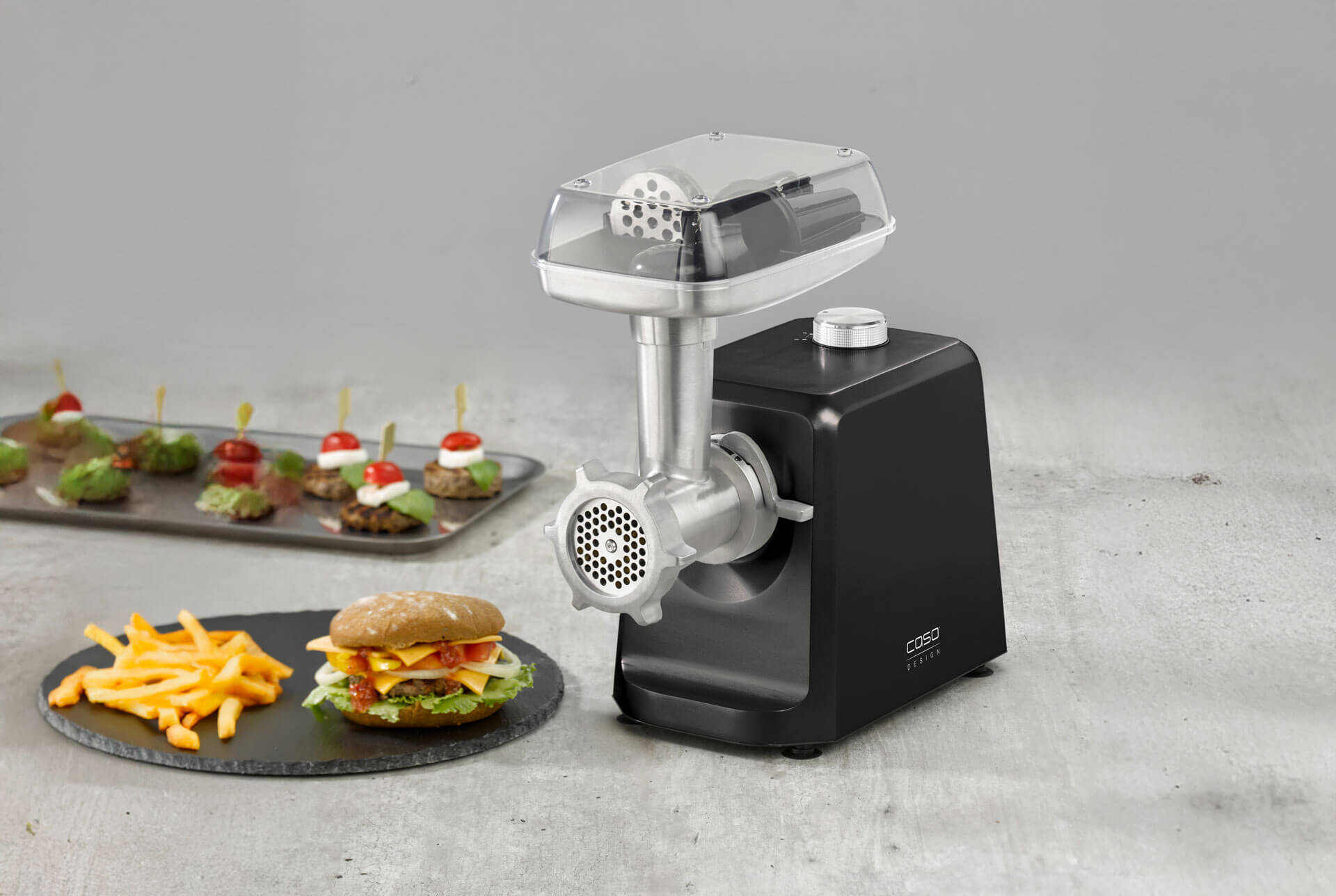 - Platzsparende Verstaumöglichkeit der Zubehörteile im Einfülltablett (3 Edelstahl-Lochscheiben (3 mm, 5 mm und 8 mm) , Wurstfüller , Spritzgebäck-Aufsatz mit 4 Formen , Stopfer)