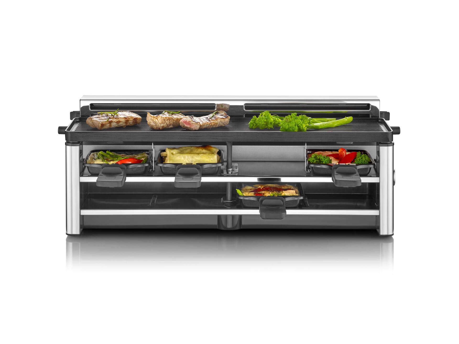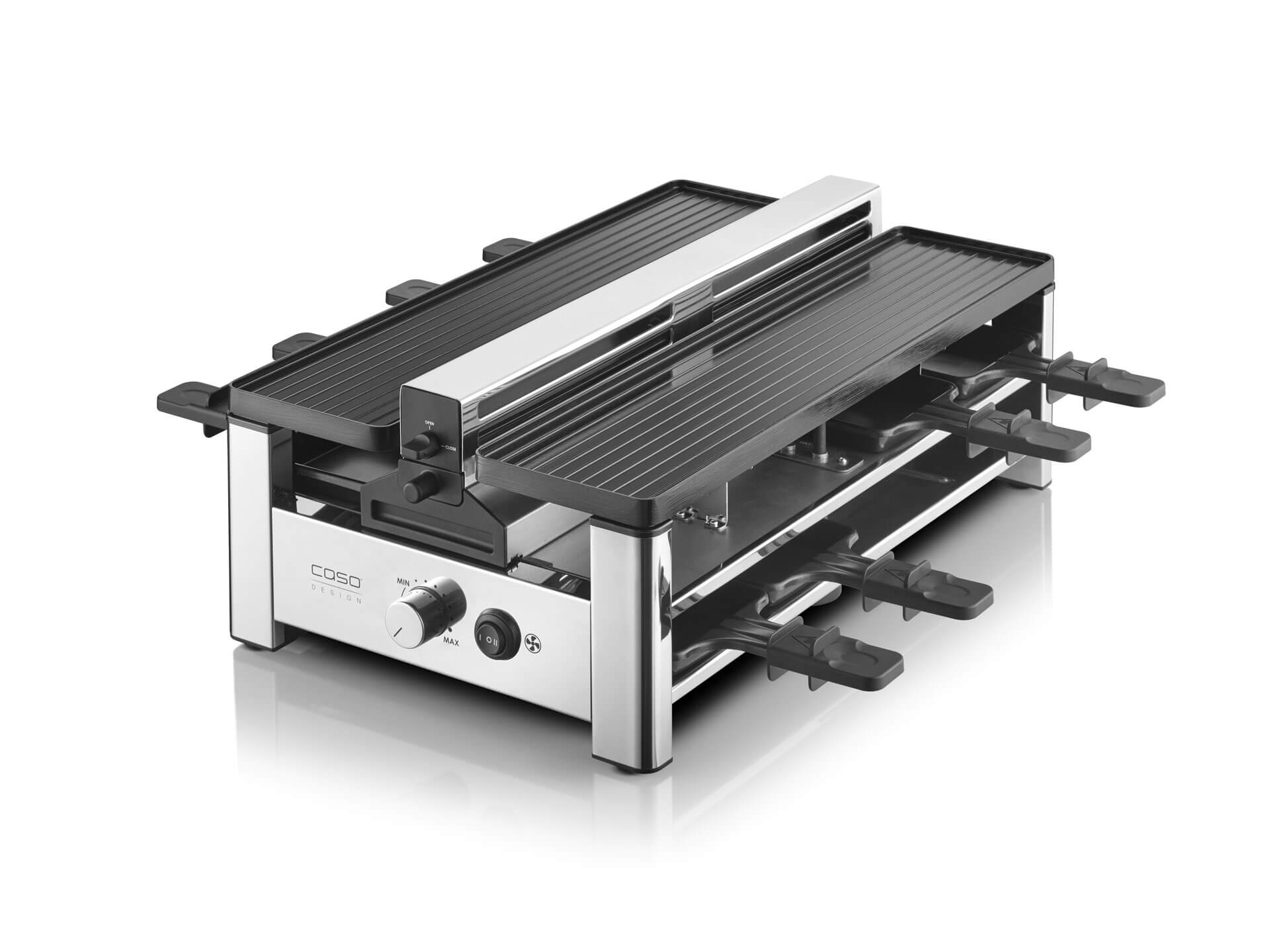 - Raclettegrill mit 8 antihaftbeschichteten Pfännchen (PFAS-frei) für bis zu 8 Personen