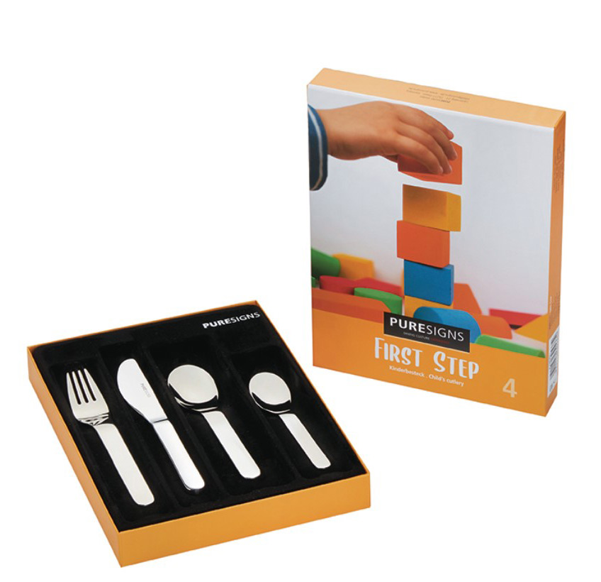 Das Kinderbesteck First Step wird in Hochglanz polierter Ausführung geliefert und bietet viel Platz für Gravuren. Die einzelnen Besteckteile sind rund, weich und in der Materialdicke leichter gehalten und liegen damit für die Zielgruppe ab 1 Jahr perfekt in der Hand.