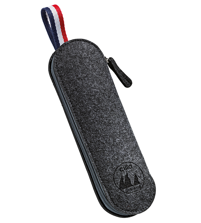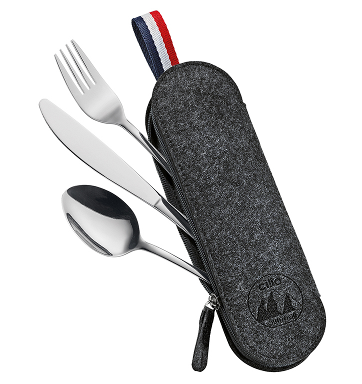 Messer, Gabel, Löffel in praktischer Filztasche.