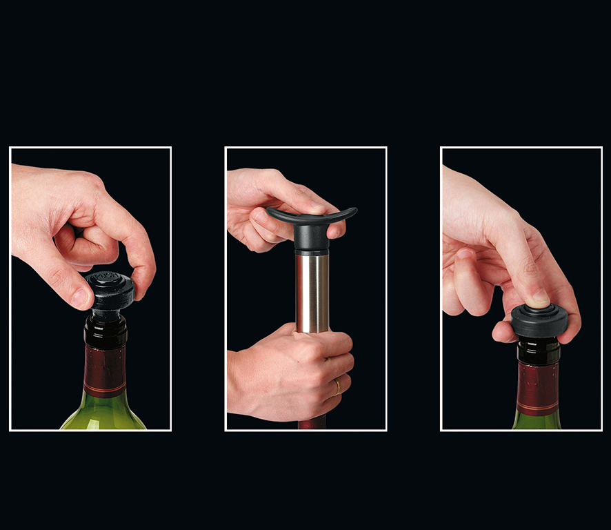 Der Abend war schön, der Wein köstlich, jetzt ist noch ein Rest in der Flasche. Wenn dieser mit dem Sauerstoff in der Luft reagiert, kommt es zur Oxidation, der Wein verliert an Geschmack. Da schiebt die Vakuumpumpe von cilio einen Riegel vor. Sie entzieht der Flasche die Luft und stoppt so den Qualitätsverlust. Setzten Sie einfach einen der mitgelieferten Spezialstopfen in den Flaschenhals und befestigen Sie darauf die Vakuumpumpe. Nachdem die Luft entfernt wurde, verschießen Sie die Flasche mit dem zweiten Spezialstopfen und freuen sich auf ungetrübten Weingenuss. Die Stopfen aus hochwertigem Kunststoff und die Pumpe aus rostfreiem Edelstahl und Kunststoff lassen sich leicht reinigen. Das praktische Gerät sollte in keiner Hausbar fehlen und ist ein schönes Geschenk für Wein-Liebhaber.