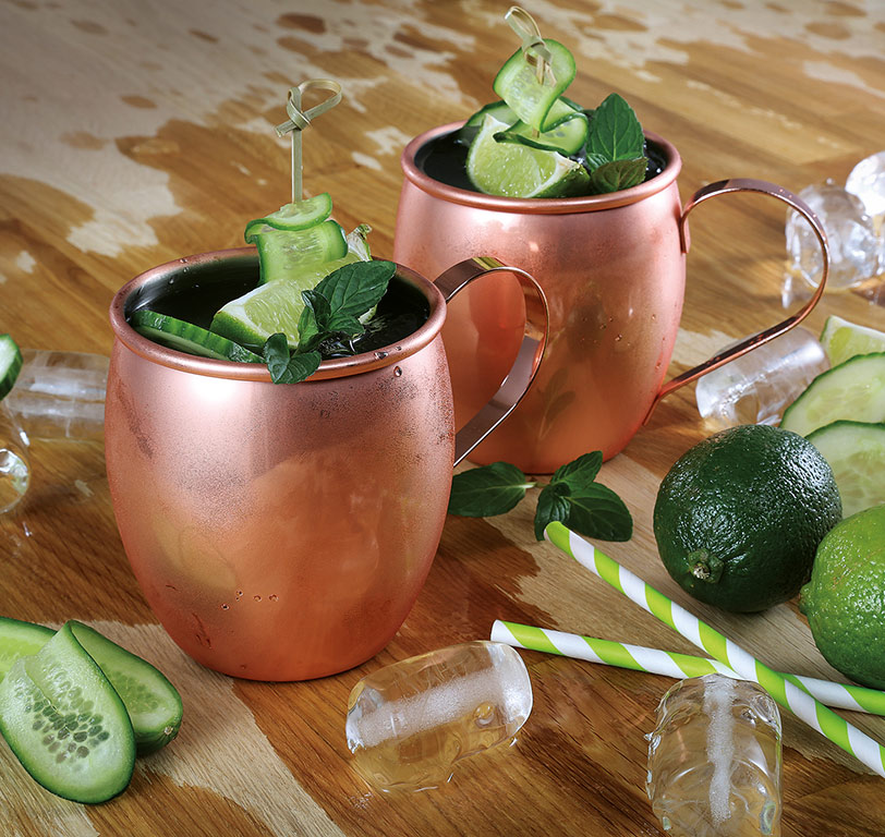 Der Cocktailshaker glänzt in der Abendsonne, der MOSCOW MULE Becher und der kleine Ableger für MOSCOW MULE Shot warten darauf, befüllt zu werden. Mit den stilvollen Accessoires aus Kupfer von cilio heben Sie Ihre Hausbar auf ein neues Niveau. Die Profi-Saftpresse, das Barmaß und der Caipirinha-Stößel aus dem edlen Material sorgen dafür, dass der Feierabend-Drink oder das Glas in gemütlicher Runde noch mal so gut schmeckt. Apropos: Stellen Sie die Becher vor dem Servieren in das Gefrierfach – Ihre Gäste werden es zu schätzen wissen. Die MOSCOW MULE Becher liegen gut in der Hand, sie sind wahlweise mit oder ohne Hammerschlag erhältlich. Darin kommt auch die alkoholfreie Variante des Trend-Getränks mit Ginger Beer, Zuckersirup, Limettensaft, Ingwer und Gurke groß heraus.