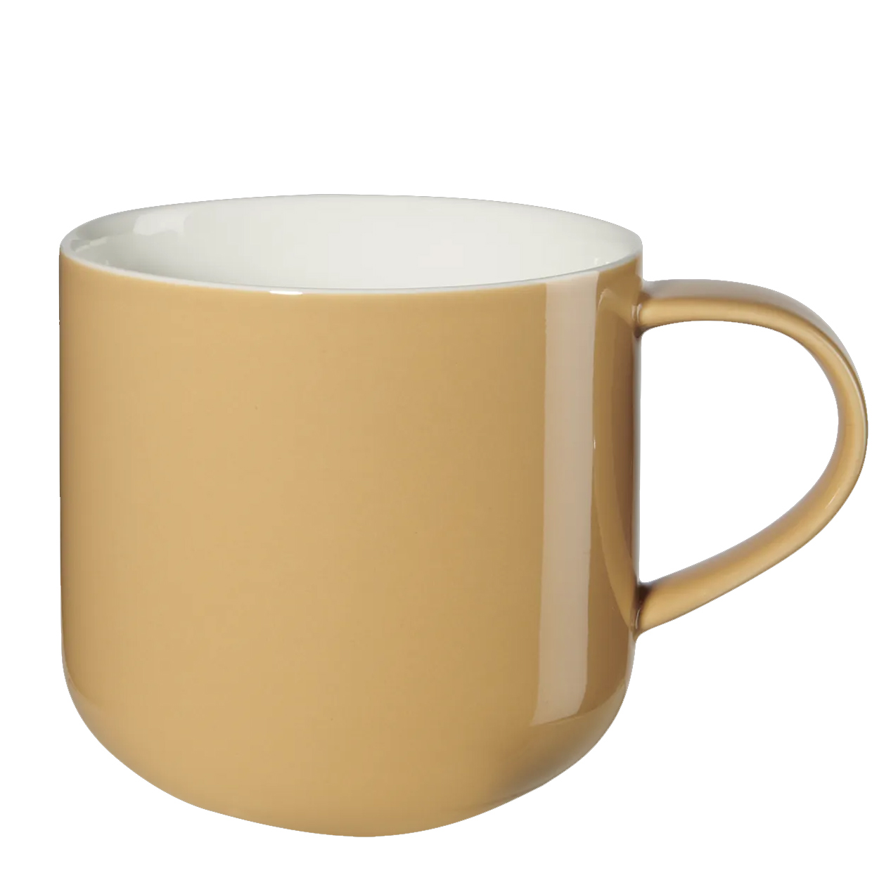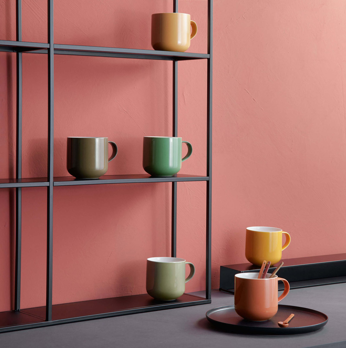 Großer Henkelbecher aus Porzellan. Der Becher mit Henkel aus der Becherserie Coppa hat einen Durchmesser von 9,2 cm und ist 9,5 cm hoch. Die weiß glänzende Becherinnenseite steht im stimmigen Kontrast zur roten Außenseite. Damit holen Sie sich Farbe an Ihren Frühstückstisch oder an Ihre Kaffeetafel! Die Form des Bechers ist schlicht designt und passt sich damit passend Ihrem restlichen Geschirr an. Der Henkelbecher ist großzügig dimensioniert und hat ein Fassungsvermögen von 400 ml.