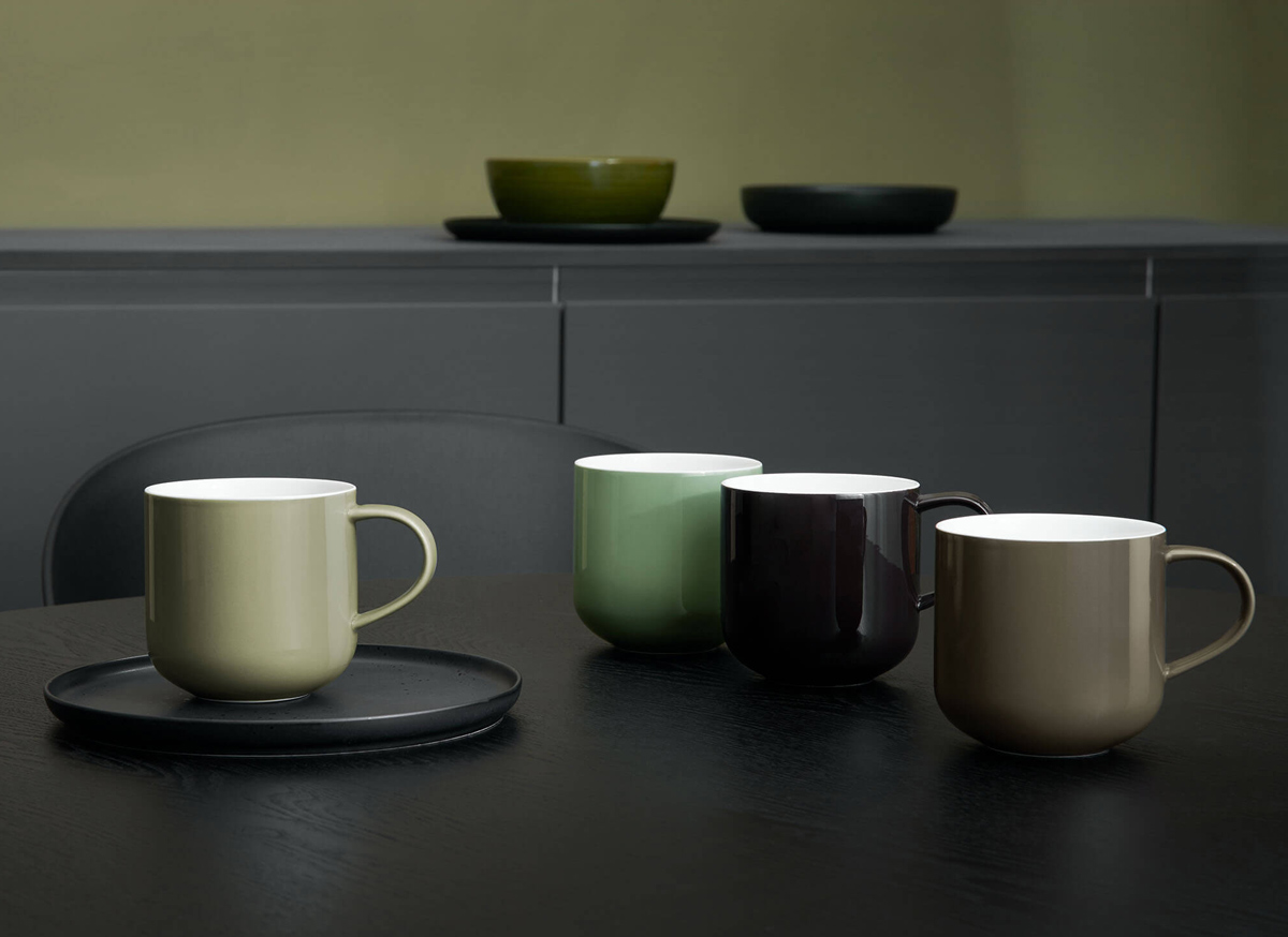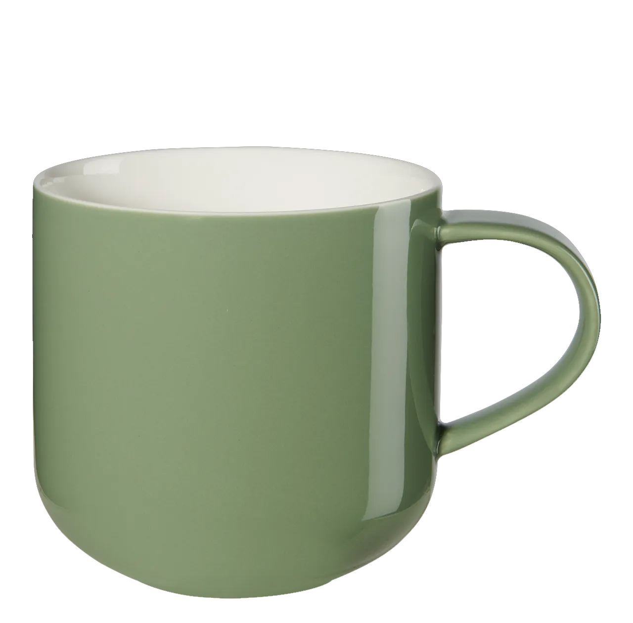 Großer Henkelbecher aus Porzellan. Der Becher mit Henkel aus der Becherserie Coppa hat einen Durchmesser von 9,2 cm und ist 9,5 cm hoch. Die weiß glänzende Becherinnenseite steht im stimmigen Kontrast zur roten Außenseite. Damit holen Sie sich Farbe an Ihren Frühstückstisch oder an Ihre Kaffeetafel! Die Form des Bechers ist schlicht designt und passt sich damit passend Ihrem restlichen Geschirr an. Der Henkelbecher ist großzügig dimensioniert und hat ein Fassungsvermögen von 400 ml.