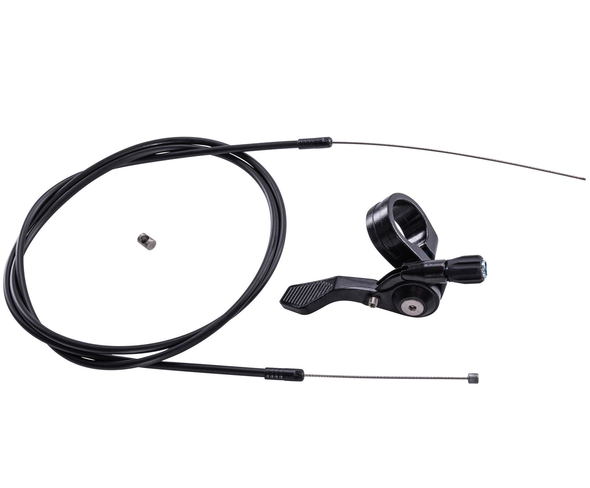 Die Sattelhöhe kannst du ganz einfach per Schalter am Lenker verstellen. Durch Betätigen des Hebels senkt oder hebt sich der Sattel dann stufenlos. Die extra Teflon-Beschichtung schützt die Stütze zum einen vor Lackschäden, zum Anderen lässt sich die Sattelhöhe dadurch flüssiger einstellen. Maximal zulässiges Fahrergewicht: 120 kg.