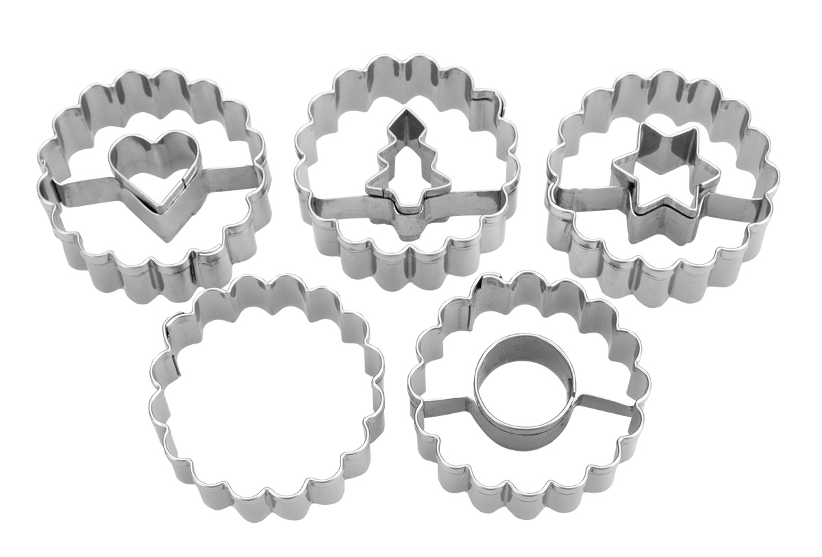 Mit diesen Ausstechformen können Sie Ober- und Unterteil der beliebten Spitzbuben ausstechen. Für die Oberteile stehen Ihnen vier Motive zur Auswahl. Mit dem Außenring können Sie nun die Unterteile für die Spitzbuben ausstechen. Beide Teile nun backen und mit etwas Gelee, Marmelade, Zuckerguss oder Nussnougatcreme aufeinandersetzen – fertig. Viel Spaß beim Backen und Verzieren! Leckere Rezepte finden sie in unserem Rezeptportal.