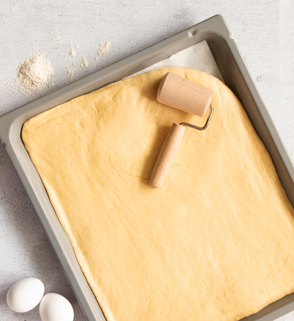 Für das exakte Ausrollen von Teig auf Backblechen macht sich diese Backblechrolle besonders gut, da sie präzise an Rändern entlang in die Ecken hineinrollen kann.