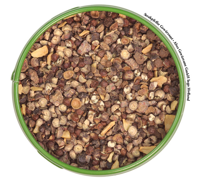 Verwendung: Geniale Pfeffermischung mit geröstetem Knoblauch für Steaks, Wild und Schmorgerichte. Für Steaks bitte frisch mit Hilfe einer Pfeffermühle mahlen.