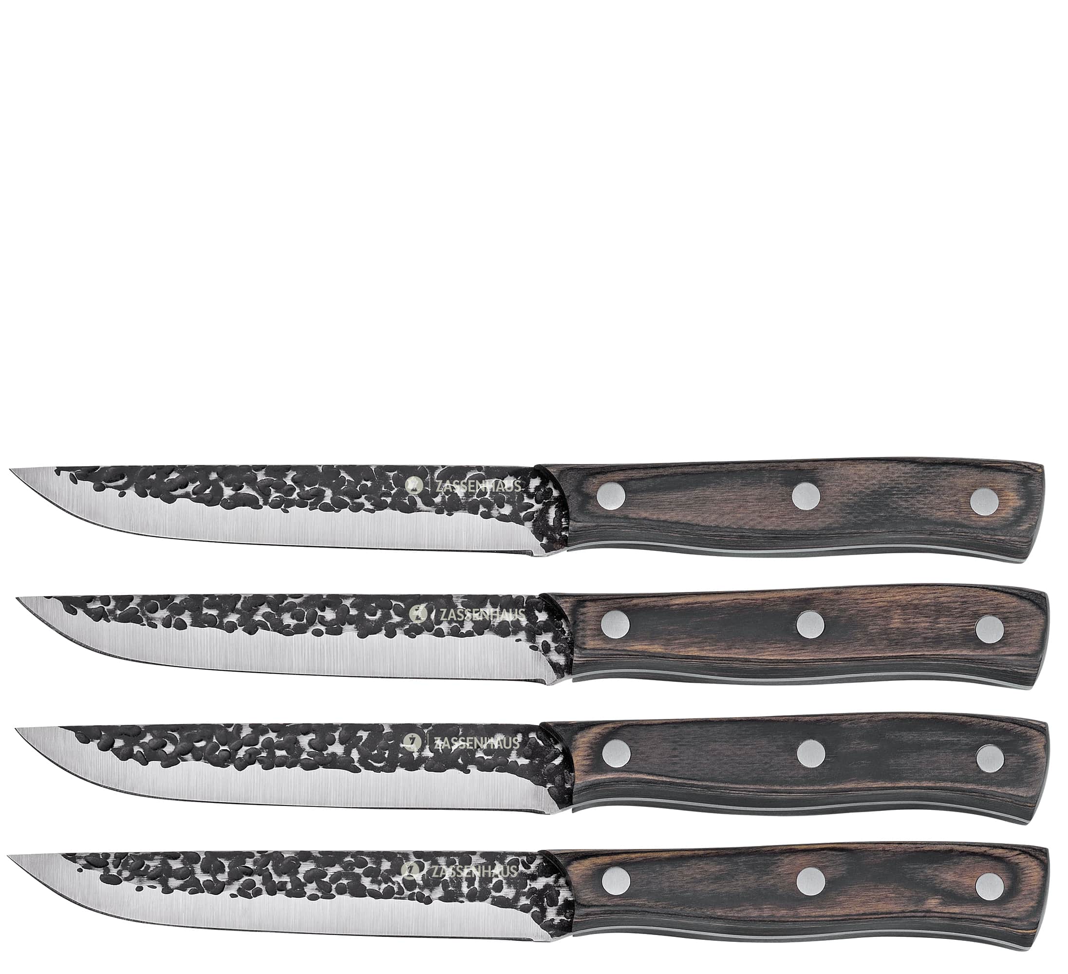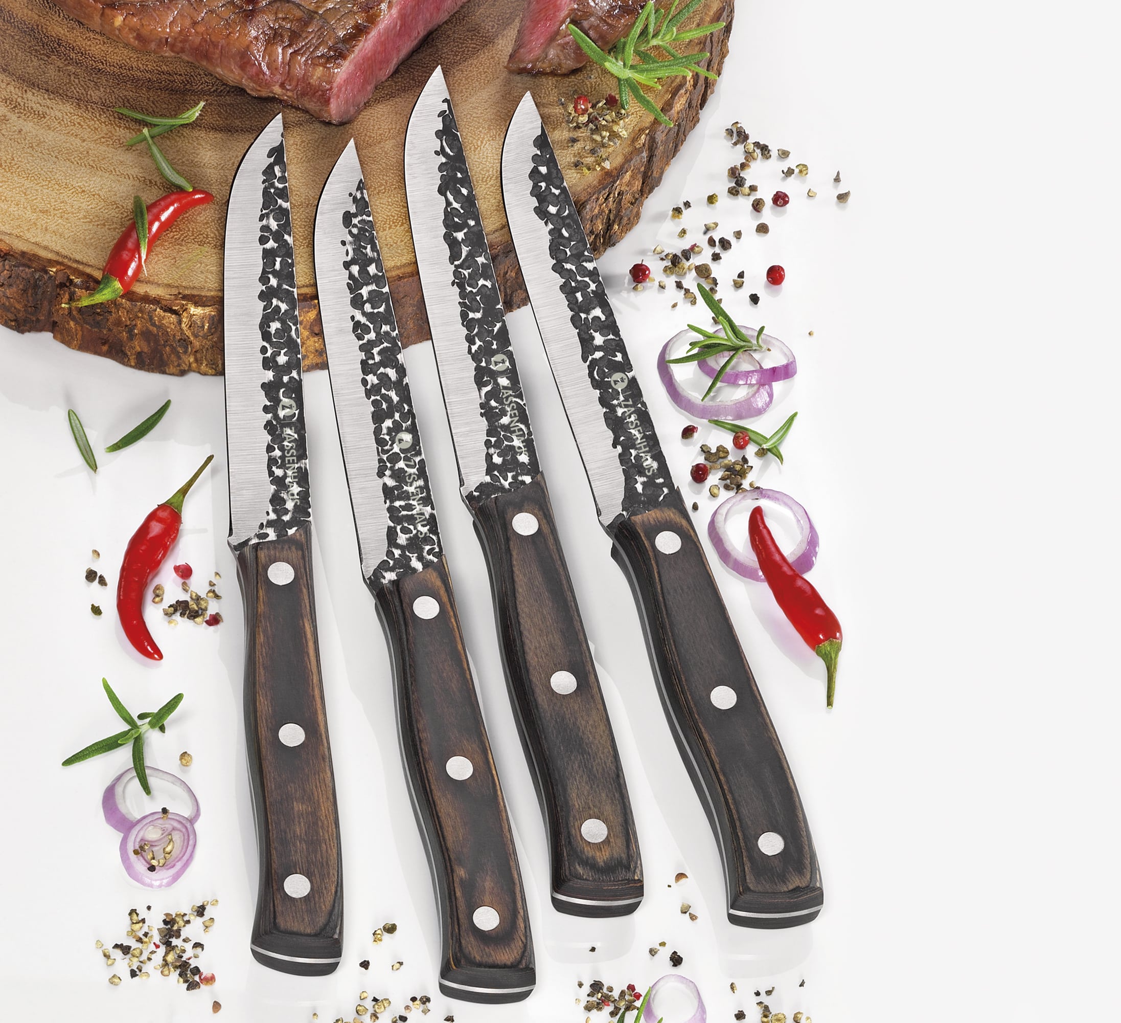 Rare, medium oder lieber well done? Die Steakmesser HUNTER von ZASSENHAUS tragen in jedem Fall zum vollendeten Genuss bei. Die Messer aus robustem Spezial-Klingenstahl schneiden sauber, ohne die Fasern zu zerreißen, die Griffe aus Pakkaholz liegen gut in der Hand. Die Unterschiede in Farbe und Maserung unter-streichen den individuellen Charakter jedes einzelnen Messers. Der Hammerschlag ist nicht nur optisch eindrucksvoll, sondern erleichtert auch das Schneiden mit Antihaft-Wirkung. 4er-Set, Klingenlänge: 13 cm.