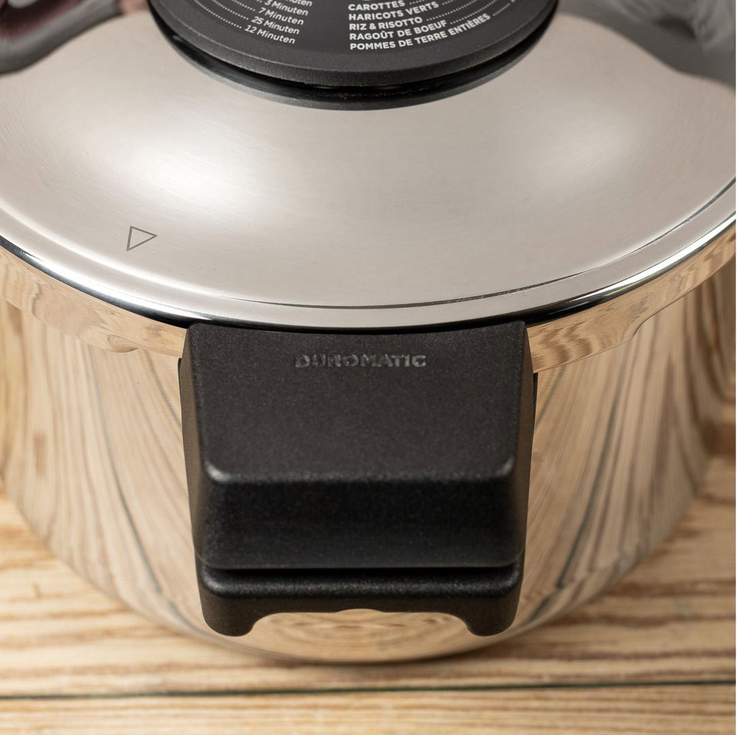 Das Kochen im DUROMATIC® ist bis zu 70 % schneller und Vitamine und Nährstoffe werden dadurch viel besser erhalten. Bei der Zubereitung im Dampfkochtopf wird zum Beispiel doppelt so viel Vitamin C erhalten* wie bei der Zubereitung in normalem Kochgeschirr. Zudem spart man bis zu 70 % Energie. Der dreifache Überdruck-Entlastungsmechanismus gewährleistet jederzeit die Sicherheit. Der ergonomische Stiel liegt gut in der Hand, egal ob der DUROMATIC® offen oder geschlossen ist, und bleibt angenehm kühl.