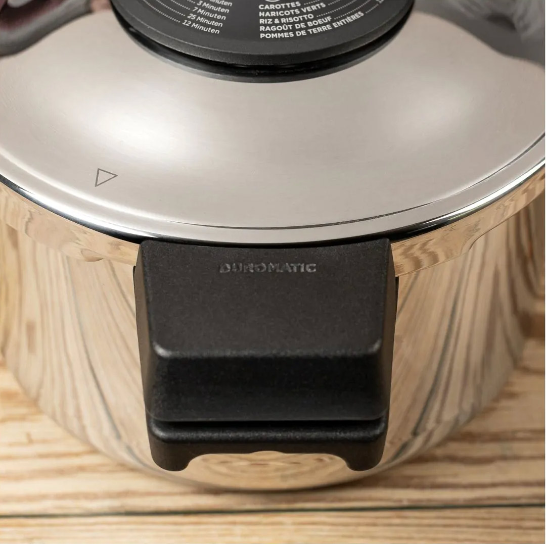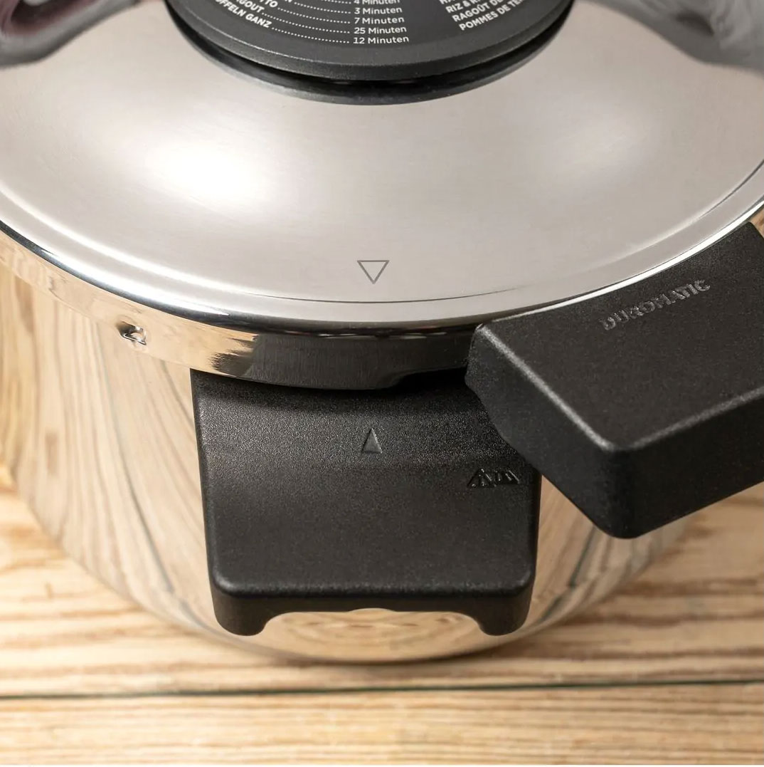 Das Kochen im DUROMATIC® ist bis zu 70 % schneller und Vitamine und Nährstoffe werden dadurch viel besser erhalten. Bei der Zubereitung im Dampfkochtopf wird zum Beispiel doppelt so viel Vitamin C erhalten* wie bei der Zubereitung in normalem Kochgeschirr. Zudem spart man bis zu 70 % Energie. Der dreifache Überdruck-Entlastungsmechanismus gewährleistet jederzeit die Sicherheit. Der ergonomische Stiel liegt gut in der Hand, egal ob der DUROMATIC® offen oder geschlossen ist, und bleibt angenehm kühl.