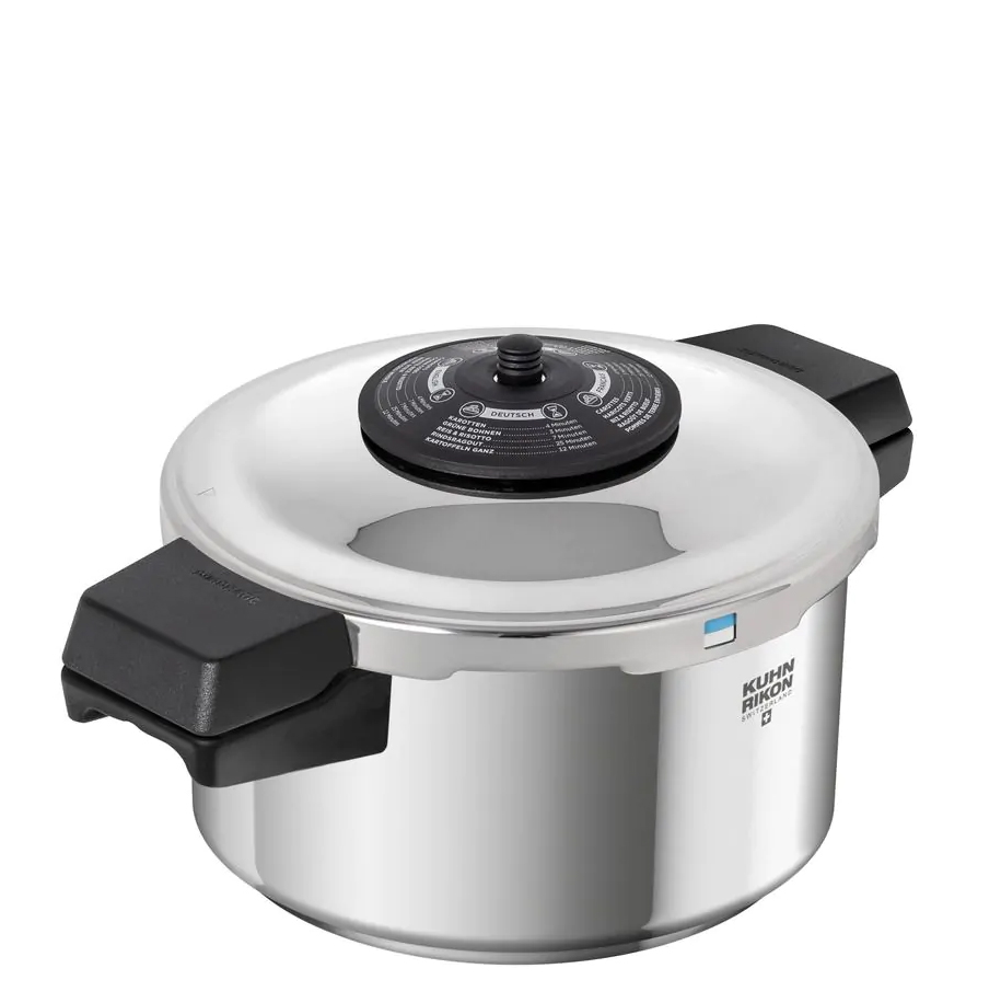 Schnellkochtopf mit Überblick: Wer lieber leckere, selbst kreierte Rezepte im Kopf behält als Kochzeiten, findet auf der Abdeckhaube des DUROMATIC® CLASSIC NEO die wichtigsten Kochzeiten für verschiedene Beilagen und Hauptspeisen notiert. Die Kochzeit aller anderen Mahlzeiten und Speisen, die Sie mit dem Schnellkochtopf zubereiten können, finden Sie in der beigelegten Kochzeitentabelle, in der Gebrauchsanweisung oder in der App. Der DUROMATIC® wird seit 1949 am Schweizer Produktionsstandort hergestellt. Dank der hohen Qualität ist er sehr langlebig.