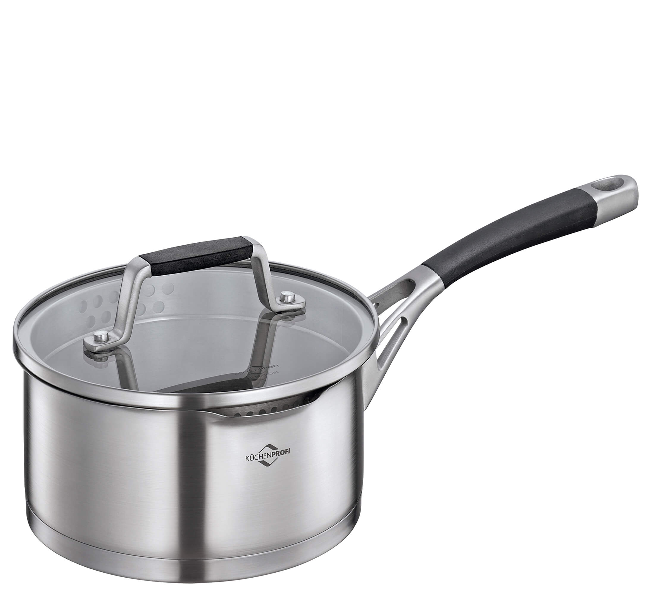 Mehrschichtboden, Deckel aus Sicherheitsglas inklusive feinem und grobem Sieb zum Abgießen. Mit praktischer Innenskala und Ausgießer. Geeignet für alle Herdarten inklusive Induktion.