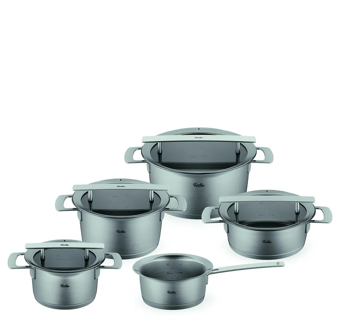 Neben dem unverwechselbaren Design verfügt die Phi Collection über vielfältige Funktionen für noch mehr Freude am. Downdraft-Funktion, Ausgießfunktion, die Einhängefunktion des Deckels oder die Stapelbarkeit aufgrund der konischen Topf-Form sind in den Produkten perfekt integriert und wirken dennoch reduziert.