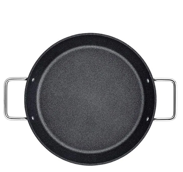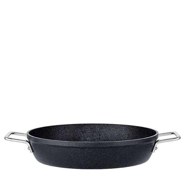 - Fissler Servierpfannenkörper mit zwei platzsparenden, seitlichen Griffen aus poliertem Edelstahl, extra hohem Rand und großer Bratfläche für komfortables, kleckerfreies Umrühren und Wenden. In ihr servieren Sie Gerichte direkt auf dem Tisch.