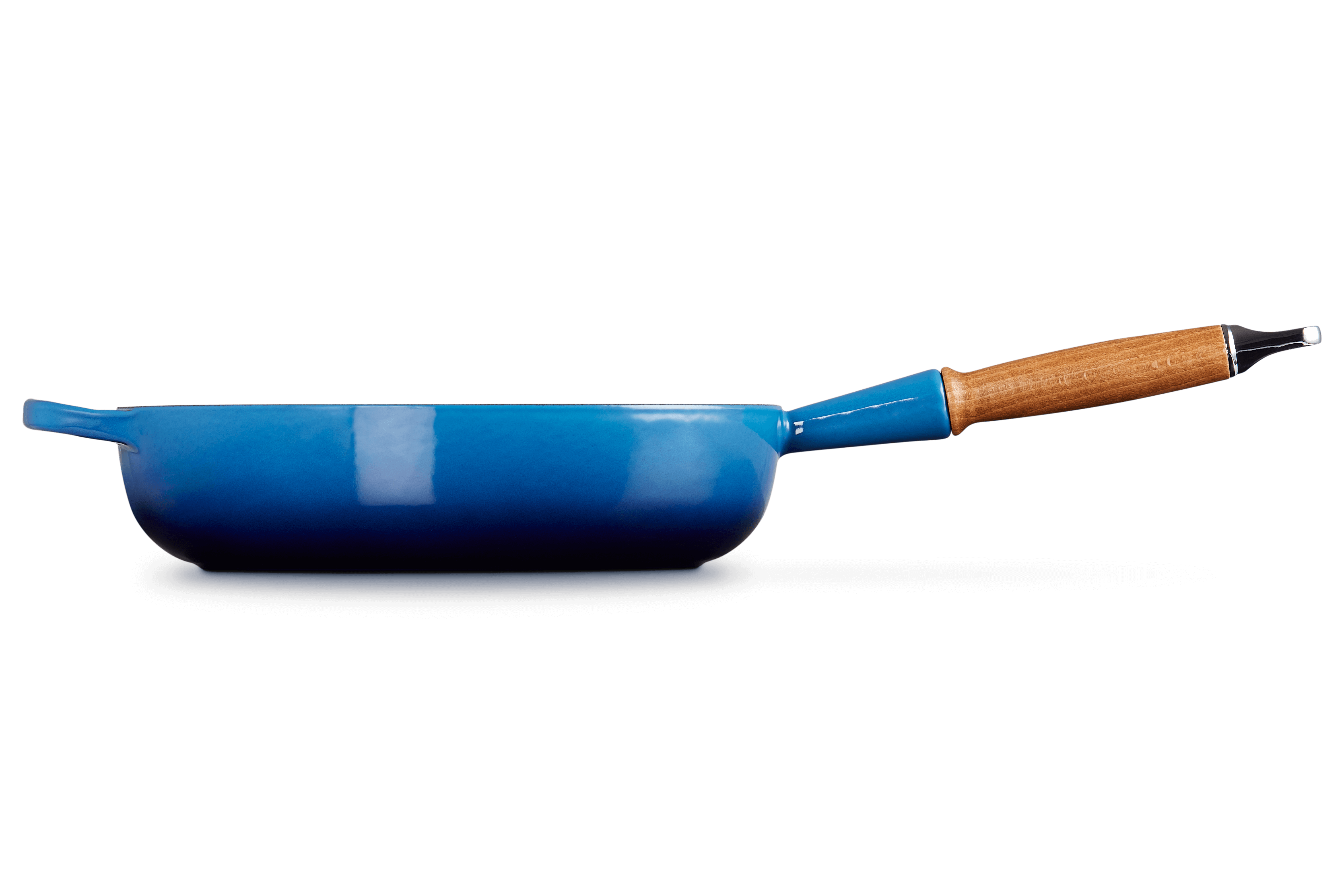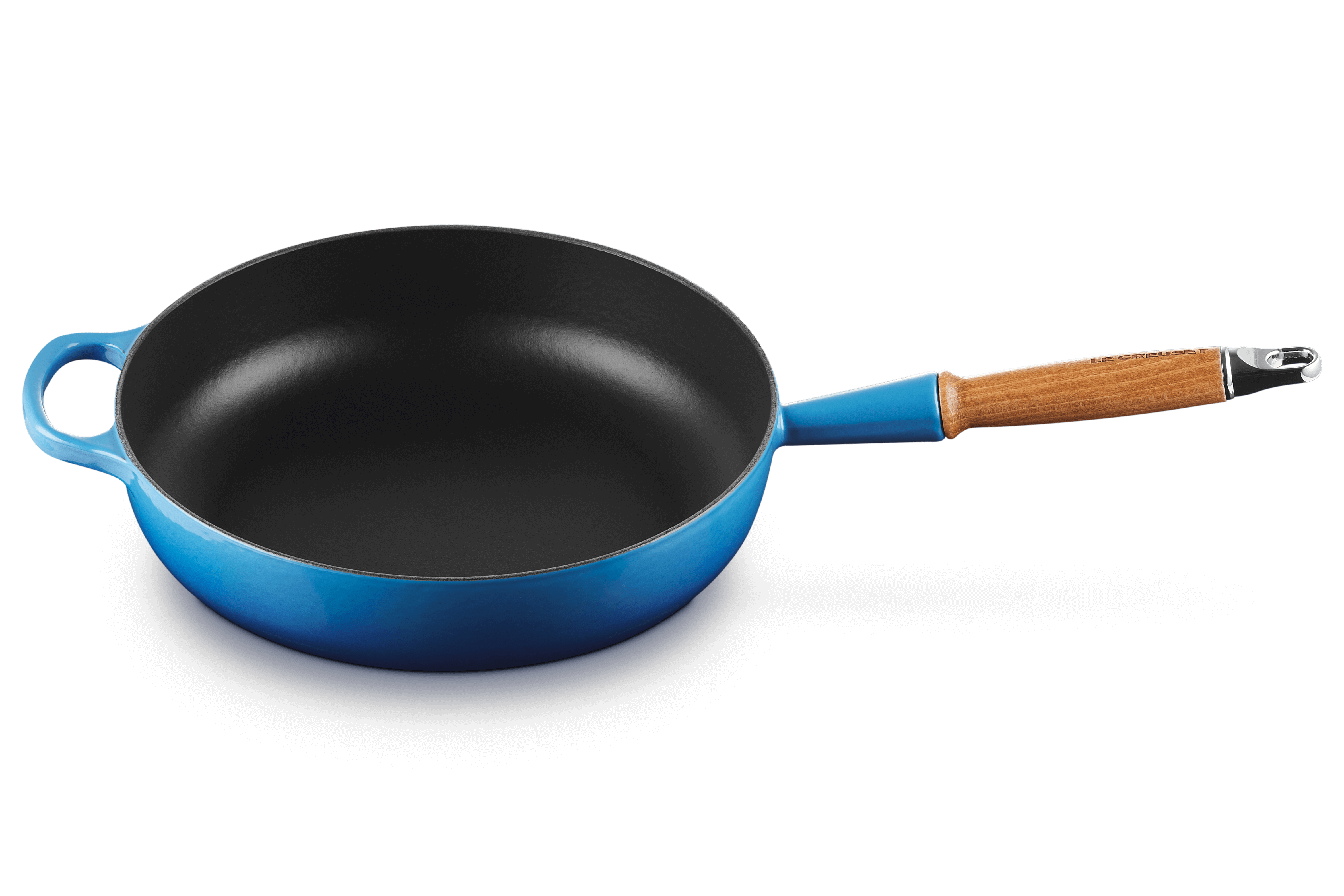 Diese gusseiserne Sautépfanne macht das Braten und Sautieren zu einer wahren Freude. Neben erhöhten Seitenwänden zum Einkochen von Flüssigkeiten verfügt die Pfanne über ein elegantes, modernes Design, darunter ein Holzgriff, der kühl bleibt, und ein großer Gegengriff, mit dem sich die Pfanne leicht greifen und bewegen lässt. Diese attraktive Pfanne ist für jede Wärmequelle geeignet, abgesehen vom Backofen (wegen des Holzgriffes). Um den Holzgriff zu schützen, sollte dieser nicht in der Spülmaschine gespült werden.