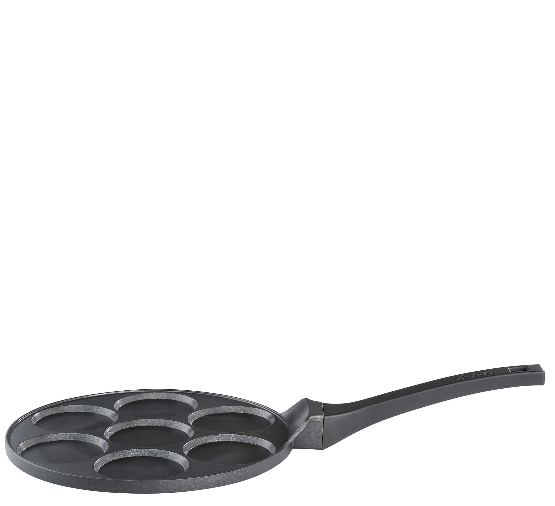 Material: Pfannen-Körper aus Aluminium in Schmiede-Qualität, Hochleistungs-Antihaftbeschichtung mit mineralisch verstärkter Grundschicht. Vollflächen-Induktionsboden. 7 Vertiefungen mit einem Durchmesser von 8 cm. Geeignet für sämtliche Herdarten inklusive Induktion.