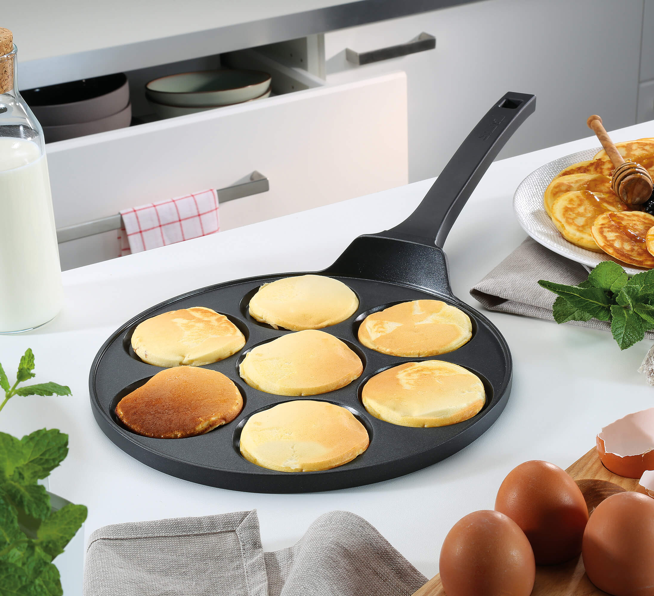 Goldgelbe Pancakes sind die Stars beim Sonntagsfrühstück und auf dem Brunchbuffet. Die Pancake-Pfanne PERFORMANCE CLASSIC von SPRING steht bereit. Der Vollflächen-Induktionsboden heizt sich schnell und energiesparend auf, der Pfannenkörper aus Aluminium leitet die Hitze optimal bis in den letzten Winkel. In den sieben passgenauen Vertiefungen gelingen Pancakes, Spiegeleier oder andere Eierspeisen perfekt. Dank der Antihaftbeschichtung gleiten die Speisen mühelos auf den Teller. An dem ergonomisch geformten Kunststoffgriff mit Wärmeisolierung tragen Sie die Pfanne wieder zum Herd und bereiten Nachschub für Ihre begeisterten Gäste zu.