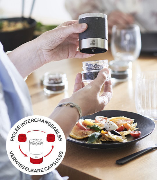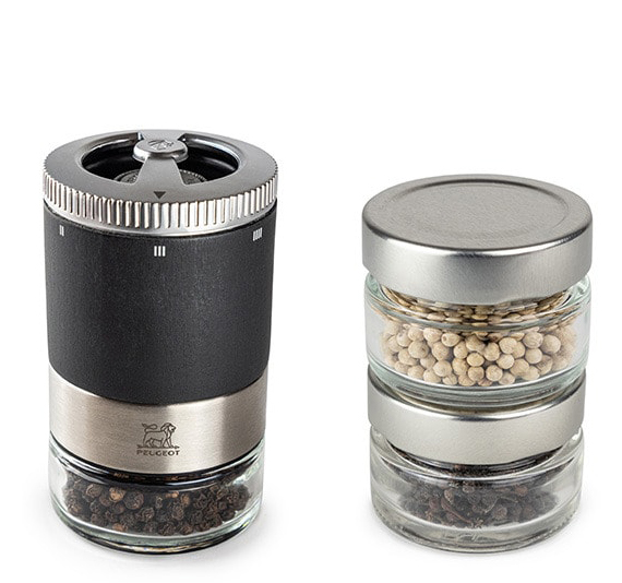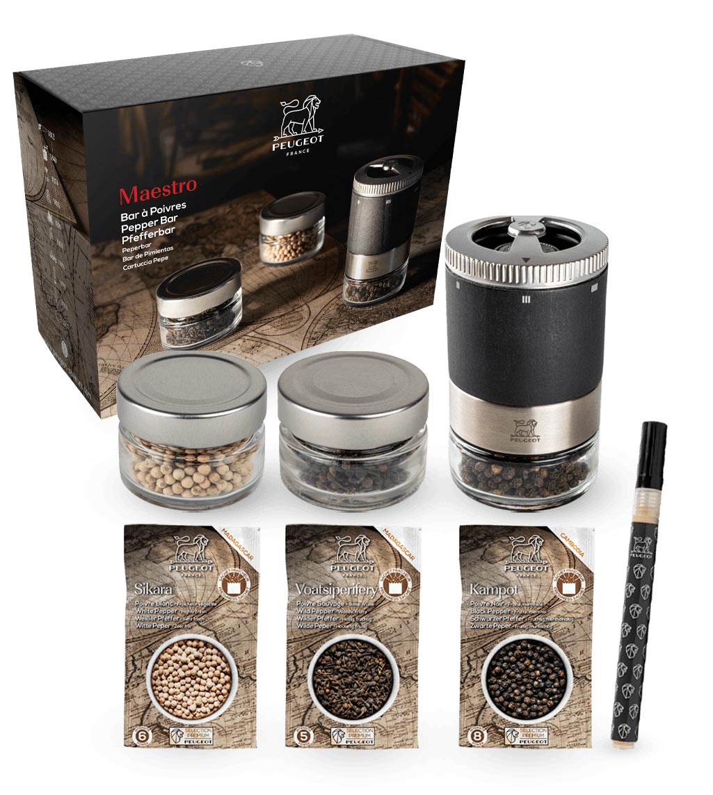 Mit der Geschenkbox Maestro bietet Peugeot das ideale Instrument, um die Welt des Pfeffers zu entdecken: eine Pfeffermühle Made in France mit drei Glasbehältern zum Auswechseln in Kombination mit einer Auswahl von drei erlesenen Pfeffersorten mit außergewöhnlichen Aromen. Maestro lädt zu einer neuartigen, geselligen Erfahrung rund um Pfeffer und seinen Geschmack ein. Um das volle Aroma des Pfeffers zu entfalten, spielt die Größe des Mahlgrades eine wichtige Rolle. Ein feiner Mahlgrad bringt die Schärfe des Pfeffers zum Ausdruck, ein grober Mahlgrad hebt die Aromen stärker hervor. Aus diesem Grund hat Peugeot seine Mühle Maestro mit der sechsstufigen Mahlgradeinstellung u'Select ausgestattet.