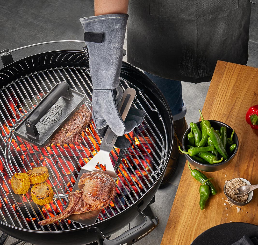 Wenn es am Grill heiß hergeht, kommen die grau-schwarzen Grillhandschuhe aus hochwertigem Veloursleder zum Einsatz!