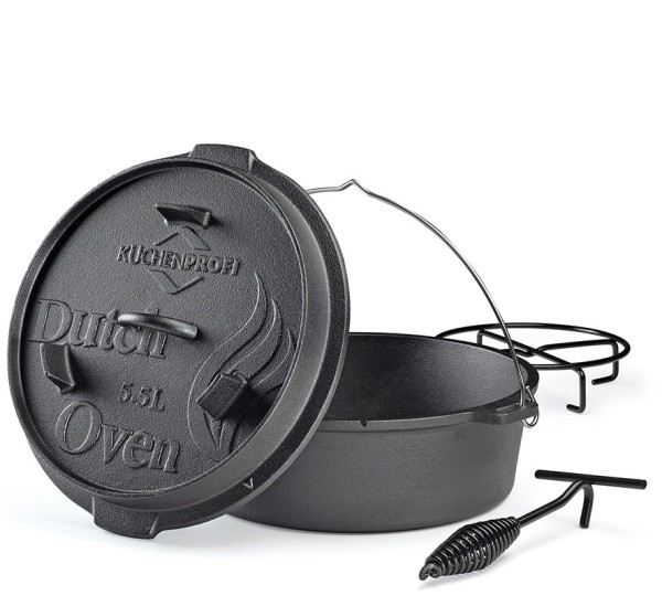 Jetzt wird es deftig! Marinierte Schweinenackensteaks und Bacon treffen auf Zwiebeln und Paprika, darüber kommt großzügig BBQ Sauce. Während das Schichtfleisch im Dutch Oven von KÜCHENPROFI auf dem Grill brutzelt und seinen Duft verbreitet, genießen Sie den Sommerabend mit Ihren Freunden oder der Familie. Auch Eintöpfe und knuspriges Brot gelingen in dem Allrounder aus robustem Gusseisen mühelos. Der Krustenbraten schmort in einem Sud aus Gemüse und Bier, in die integrierte Öffnung am Topfrand hängen Sie das Thermometer ein und überwachen die Kerntemperatur des Prachtstücks. Der Dutch Oven ist geeignet für Grills, Feuerschalen, alle Herdarten und Backofen. Tipp: Nutzen Sie den Deckel zur Zubereitung von Pizza.