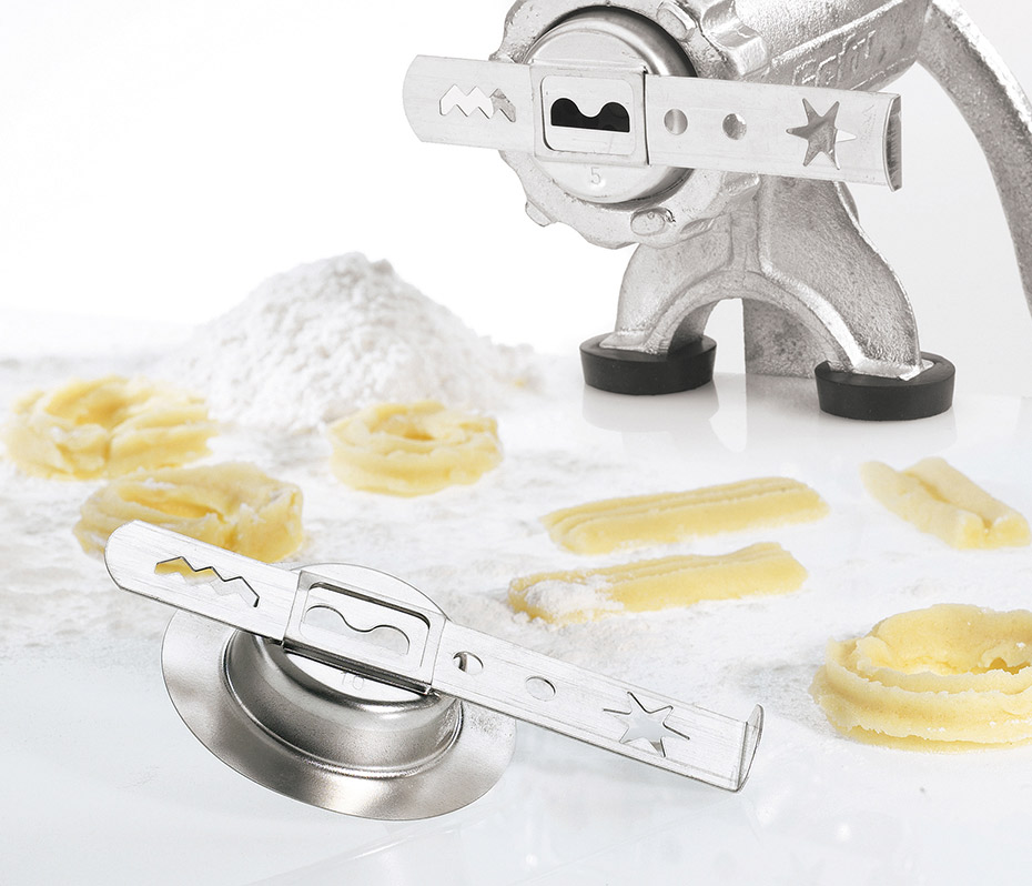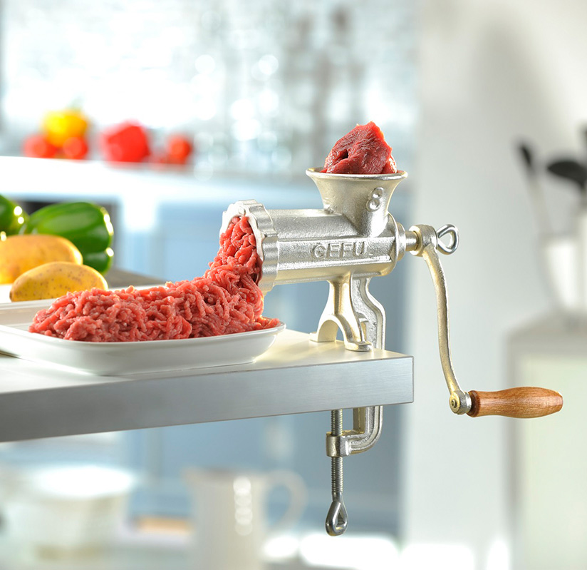 Fleischwolf Größe 5 inkl. kostenlosem Spritzgebäckvorsatz Artikel-Nr. 00017 Lochscheibe 4, 5 mm Edelstahl rostfrei Extra hohe Tischklemme bis 6 cm Schneidmesser Edelstahl rostfrei Stahlguß, Oberfläche verzinnt Zugabe Spritzgebäckvorsatz aus Edelstahl EAN 40 06664 00017 8 Der traditionelle Helfer für das Herstellen von Hackfleisch und Tatar ist vielseitiger, als Sie denken: Sie kennen ihn als Spritz-gebäckmaschine in der Weihnachtszeit, aber auch außerhalb dieser Saison lassen sich exquisite Backideen z. B. für aromatisches Teegebäck hervorragend mit ihm umsetzen. Besonders die extra hohe Tischklemme lässt den Fleischwolf auch in modernen Küchen hervorragend aussehen. Robuste Qualität, Edelstahl-Lochscheiben 4,5 mm, mit Edelstahl-Schneidmessern, leichtgängig und stark.