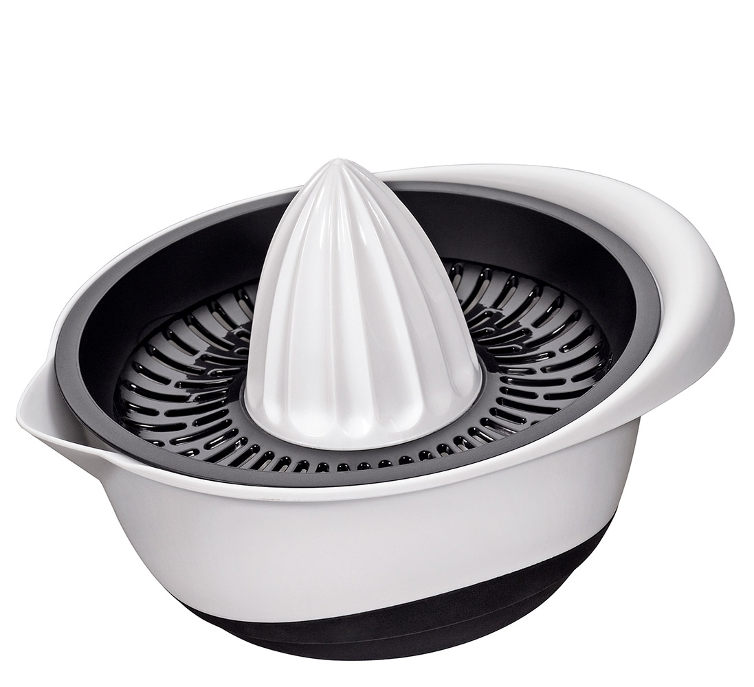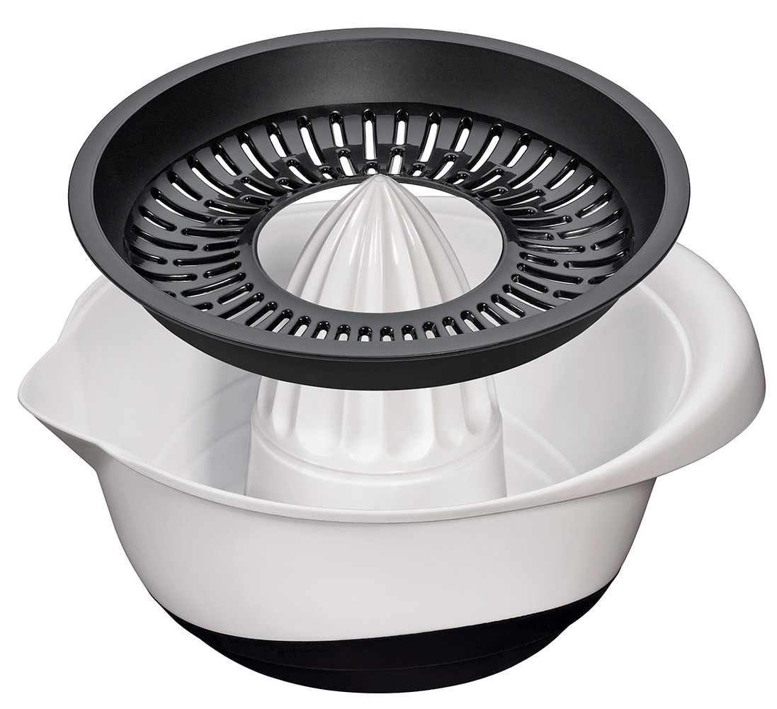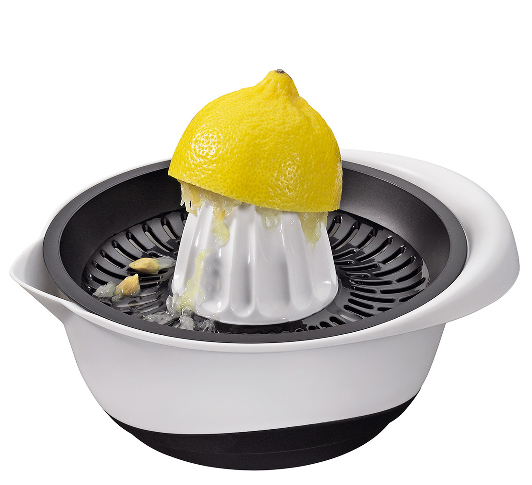Kleiner Spritzer, große Wirkung. Zitronensaft verleiht Salatdressings, Fisch- und Fleischgerichten Pfiff. Er sorgt für den Frische-Kick in Kuchen, Desserts oder Drinks. Mit Hilfe der KÜCHENPROFI Zitronenpresse EASY gelangen Sie ganz leicht an den Geschmacksbooster. Die Presse aus robustem Kunststoff hat ein Sieb, das Kerne und große Fruchtstücke zurückhält. Der Auffangbehälter mit praktischem Ausgießer verhindert, dass etwas von dem wertvollen Saft danebengeht. Dank des rutschfesten Bodens steht die Presse besonders sicher.