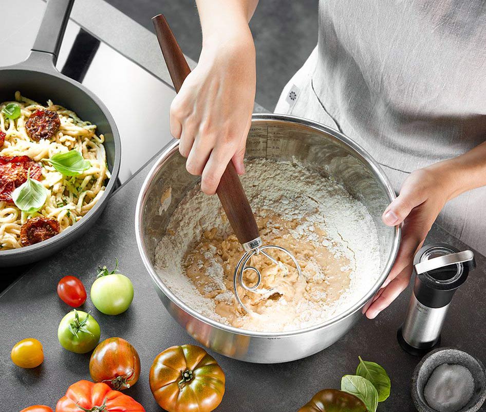 NEDO ist kein gewöhnlicher Schneebesen. Seine robusten Edelstahlschlaufen machen das Rühren und Vermischen selbst schwerer Teige zum Vergnügen und sorgen im Handumdrehen für perfekte Resultate. Wer luftiges Brot, frische Pasta, duftende Kuchen und köstliche Pfannkuchen zubereiten will, wird NEDO lieben.