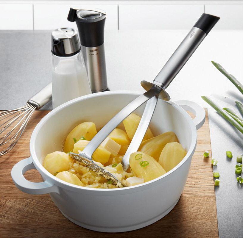 Wenn Kartoffeln, Obst oder Gemüse in Püree verwandelt werden sollen, schlägt die Stunde für den Kartoffelstampfer. Durch seine ovale Form ist er für nahezu jede Topfform geeignet und der integrierte Fingerstopp sorgt für optimalen Halt und eine erhebliche Kraftersparnis.