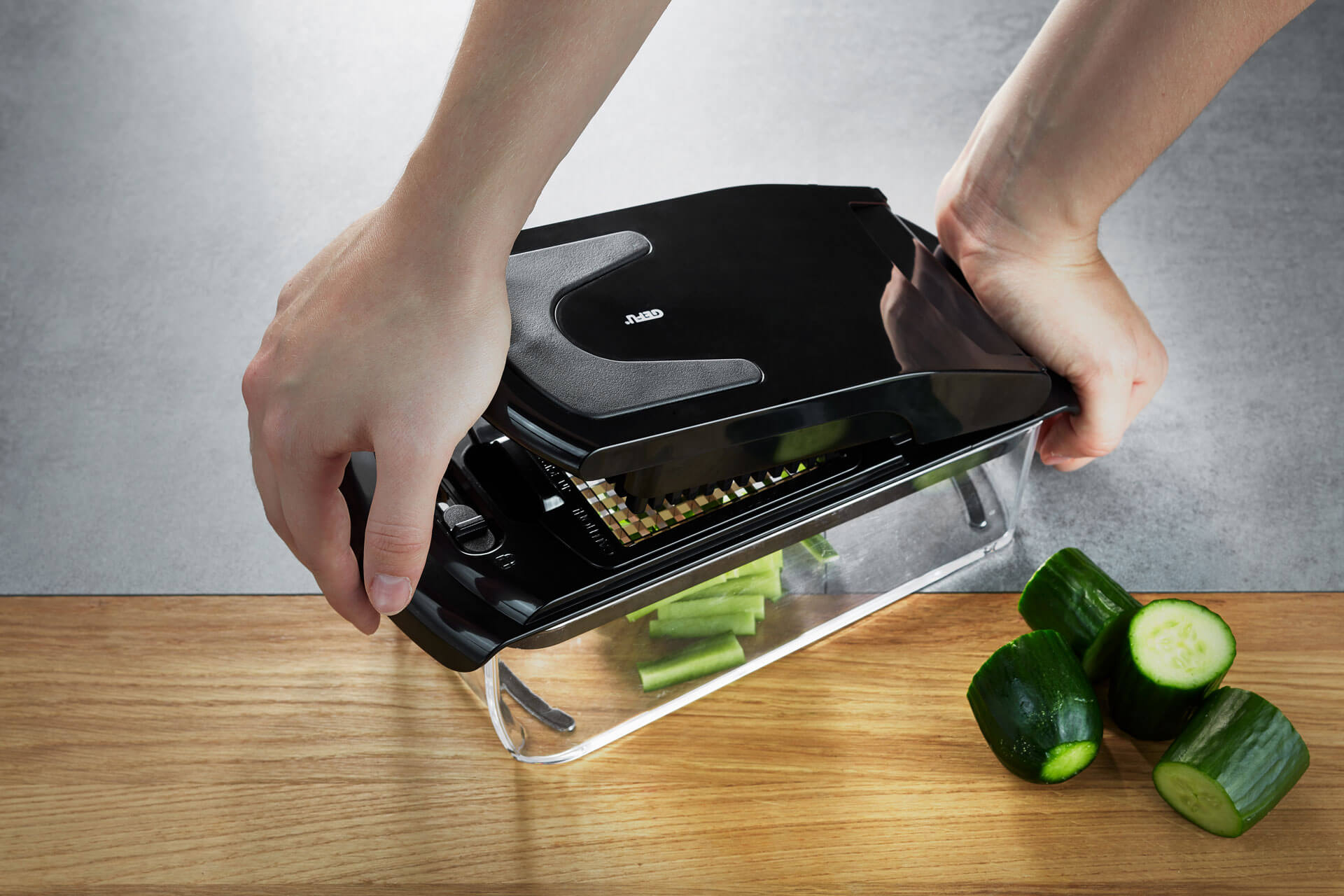 Schneller und bequemer kann man Obst und Gemüse nicht in bunte Würfel und vielseitig verwendbare Stifte verwandeln. Extrascharfe Messereinsätze sorgen für müheloses Schneiden und gleichmäßige Resultate - von fein für gesunde Rohkost oder Suppeneinlagen bis grob für Pommes Frites oder leckere Eintöpfe. Perfekt auch zum Würfeln von Fetakäse.