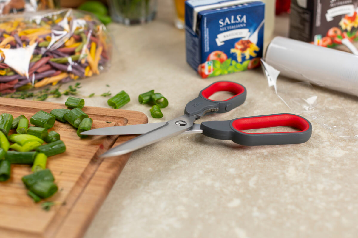 Die Allrounderin. Die Universal-Küchenschere ist ein unverzichtbarer Helfer in der Küche und eignet sich ideal zum Schneiden von Pappe, dicken Kunststoffverpackungen oder Lebensmittel.