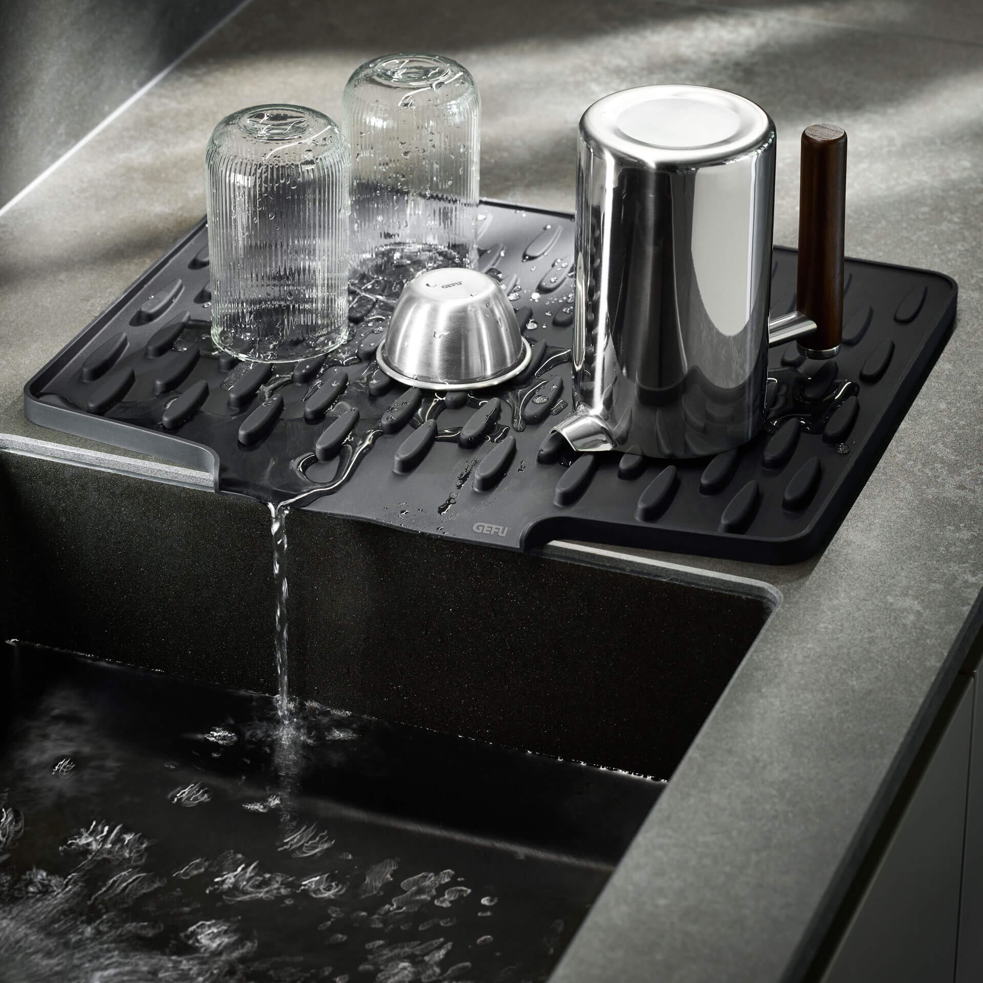 Die Abtropfmatte DRIO sorgt für schnelles, sauberes Trocknen von Gläsern, Geschirr und Lebensmitteln. Rillenstruktur, geneigte Fläche und Wasserablauf in die Spüle halten die Arbeitsfläche trocken. Schluss mit nassen Arbeitsplatten, rutschenden Gläsern und Chaos in der Küche. Die Abtropfmatte DRIO sorgt für schnelles Trocknen und vielseitige Einsatzmöglichkeiten.