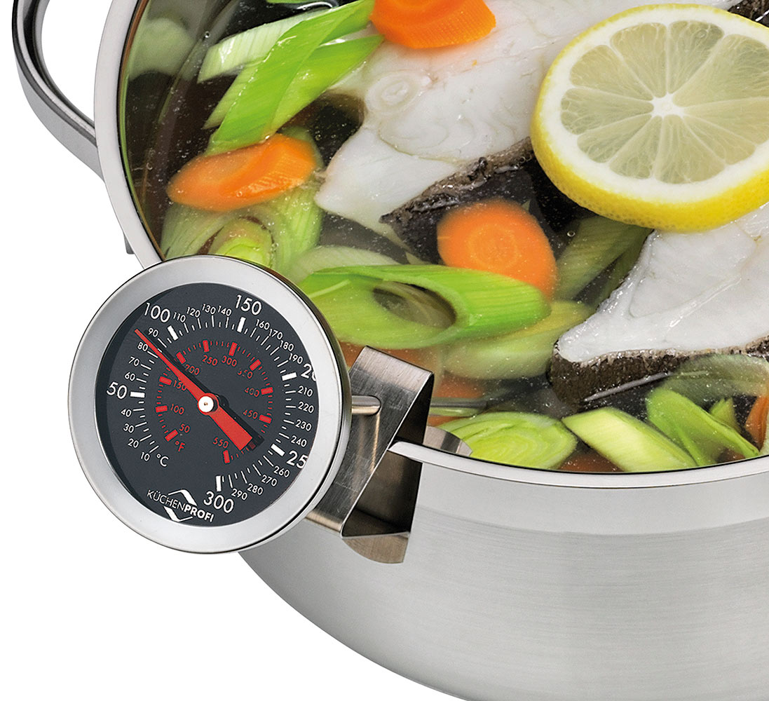 Goldgelbe Pommes Frites, zarte Tempura mit Gemüse oder Krabben, fluffige Berliner. All diese Köstlichkeiten kommen aus der Fritteuse. Das KÜCHENPROFI Frittierthermometer sorgt für ein perfektes Ergebnis. Sie befestigen es mit dem Clip einfach am Topf oder der Fritteuse und sehen, ob das Fett die ideale Temperatur von ca. 170-180 °C erreicht hat. Eine wesentlich exaktere und sicherere Methode als ein Holzstäbchen in das siedende Öl zu halten und zu schauen, ob Bläschen emporsteigen. Dank des ausgedehnten Temperaturbereichs von 0-300 °C können Sie das Thermometer auch zum Pochieren, Niedertemperaturgaren und bis ca. 160 °C als Zuckerthermometer einsetzen. Frittier-Tipp: Tauschen Sie das Öl spätestens nach fünf Vorgängen aus, da es dann verunreinigt ist und sich nicht mehr hoch genug erhitzen lässt.